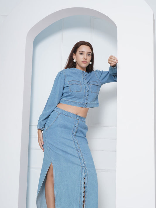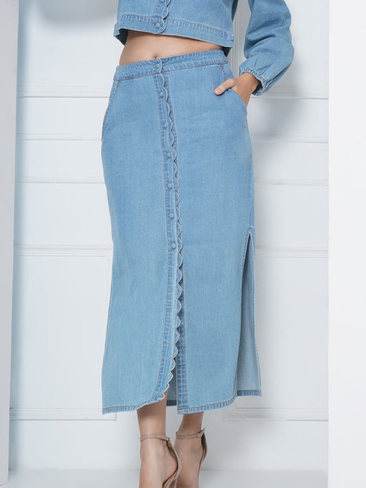 Denim Buttoned Maxi Skirt with Scallop Detail