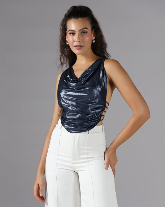 Shimmer cowl back top