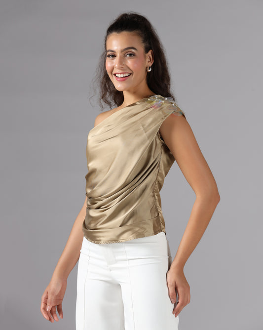 Champagne gold drape one-shoulder top