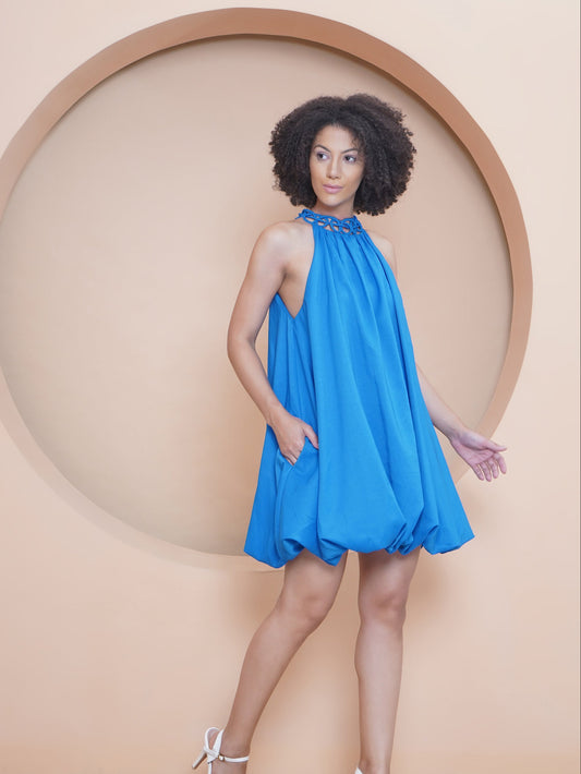 Cerulean Blue Balloon Dress with neck detailing