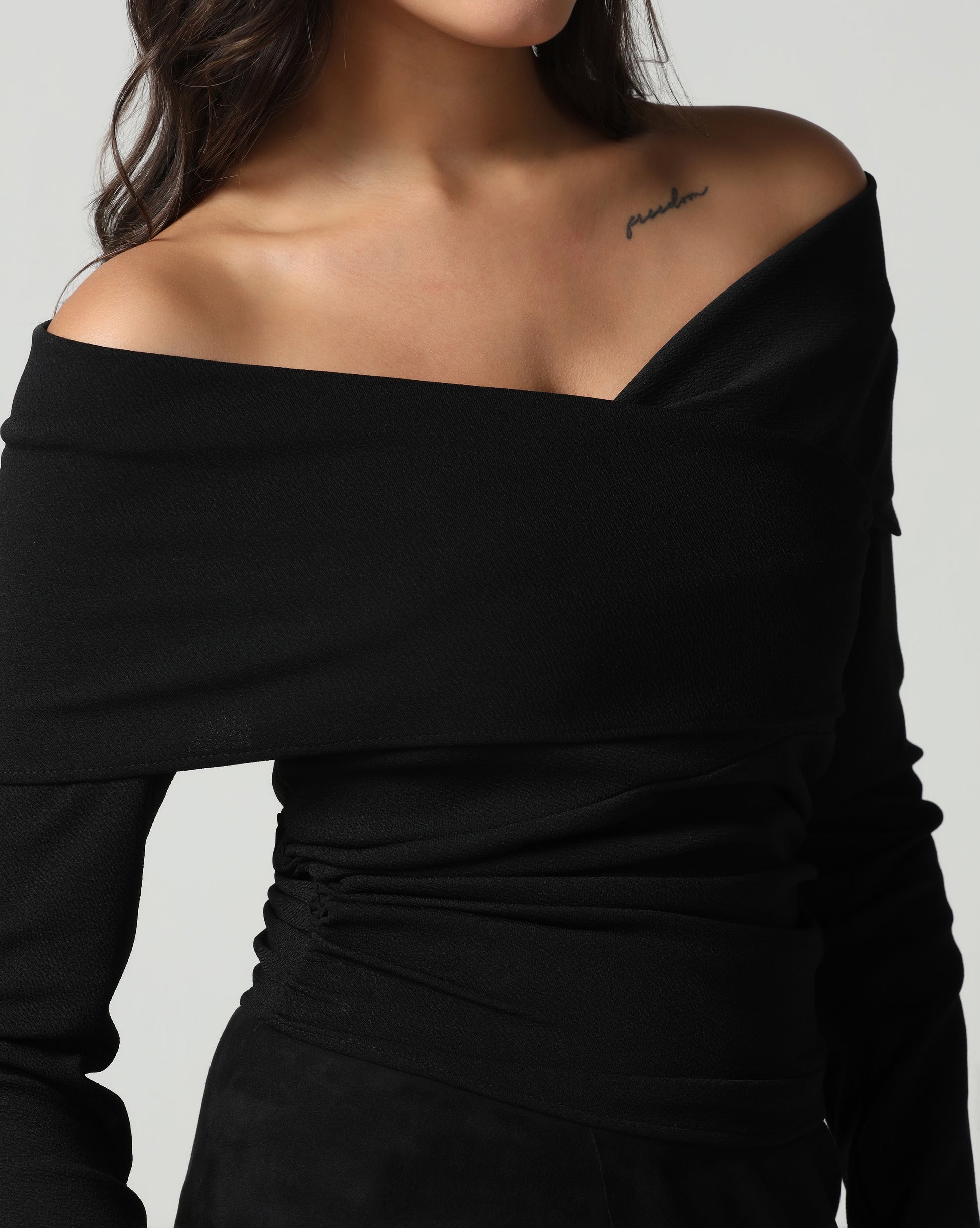 A sleek cross-front silhouette meets a flattering off-shoulder neckline in this minimalist statement top. Designed with a smooth, body-skimming fit and long sleeves for a refined winter look, it pairs effortlessly with skirts, trousers, or layered outerwear. Elevated yet understated—perfect for evening outings or polished daytime styling.