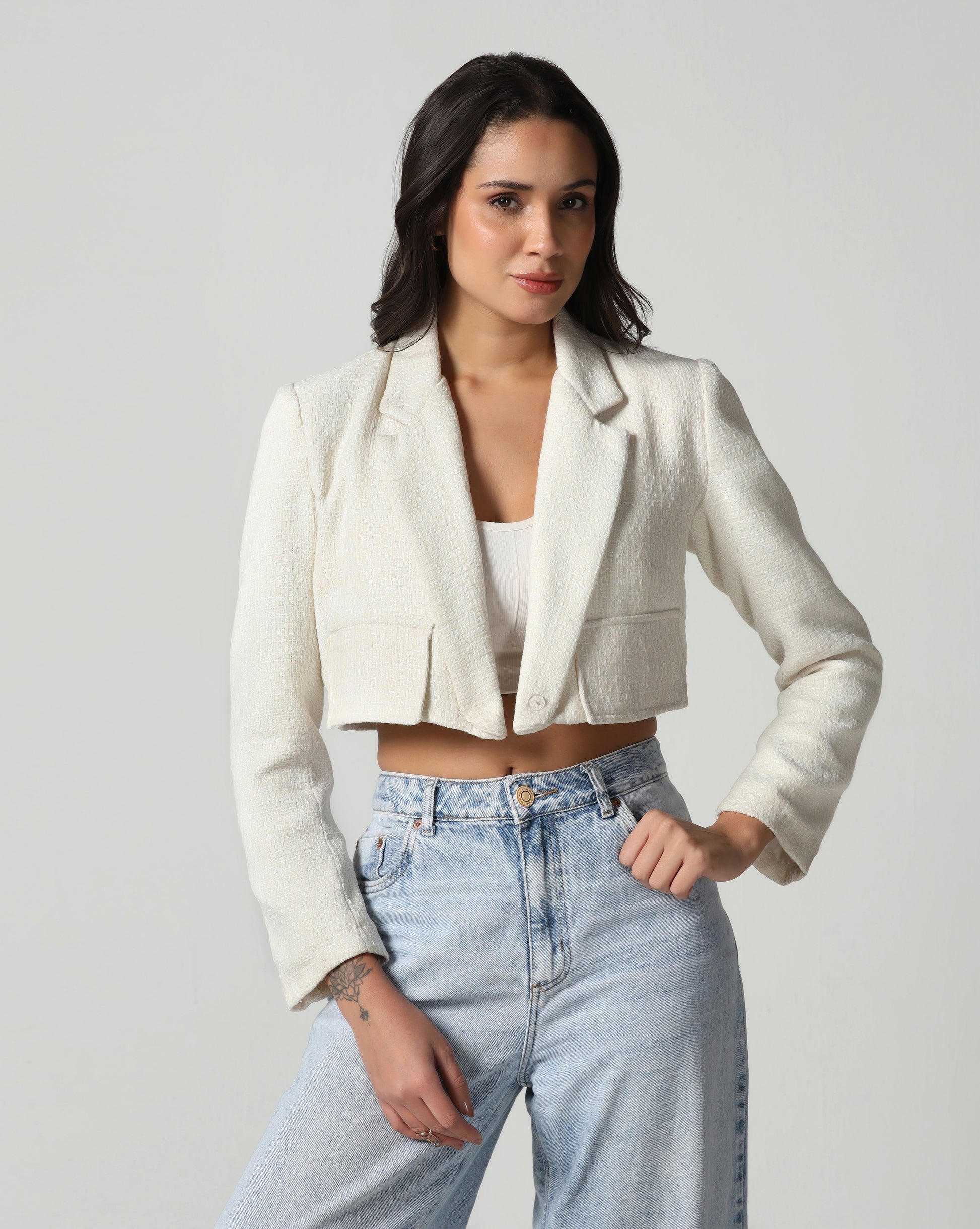 The White Tweed Crop Blazer is a refined, modern layer crafted in a soft textured tweed. Its clean cropped silhouette adds structure while keeping the look effortlessly fresh and versatile. Designed in an elegant ivory-white tone, this blazer pairs beautifully with denim, trousers, or skirts for a polished everyday style. Lightweight yet statement-making, it’s the perfect piece to elevate your winter wardrobe with minimal, timeless charm.